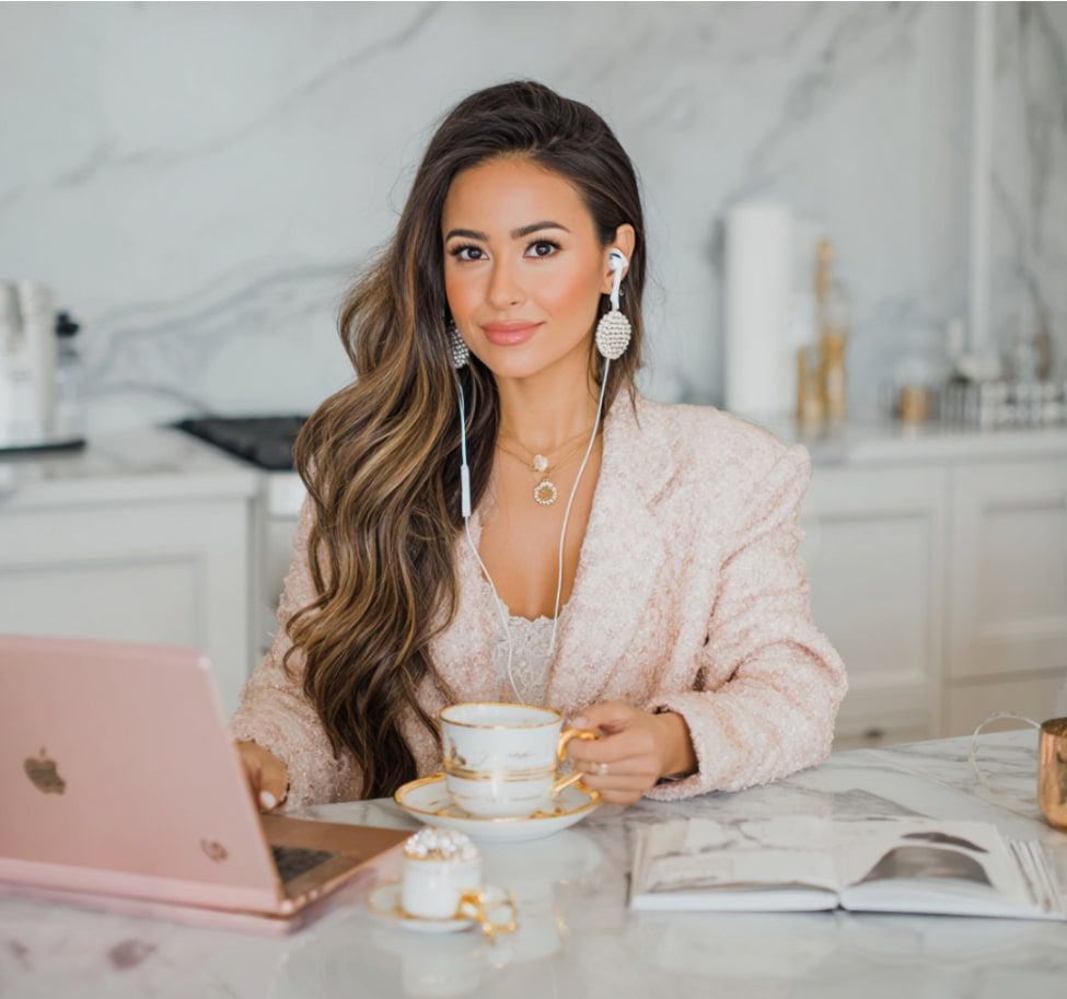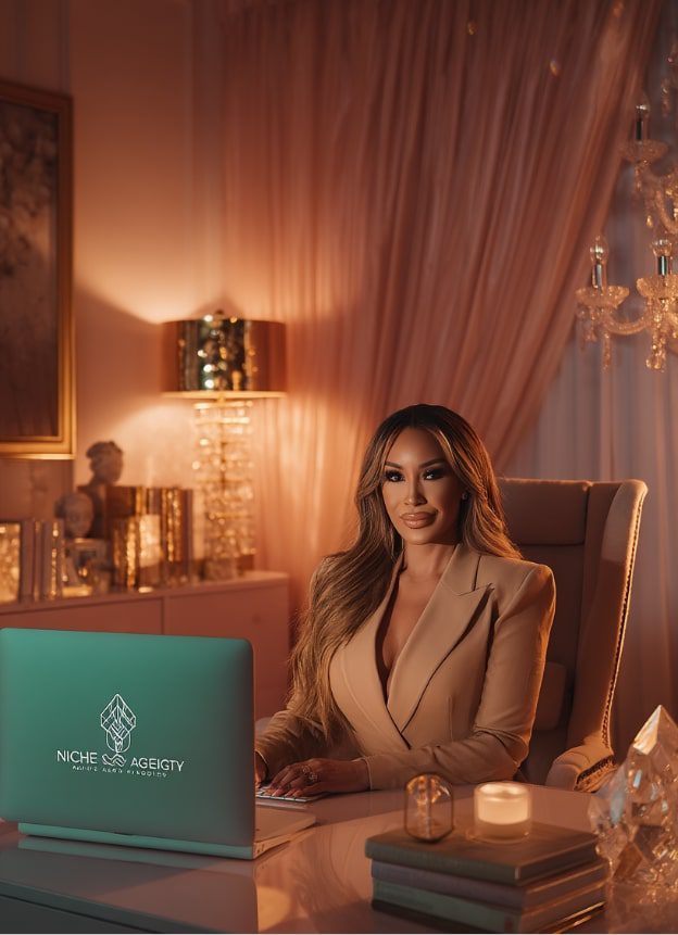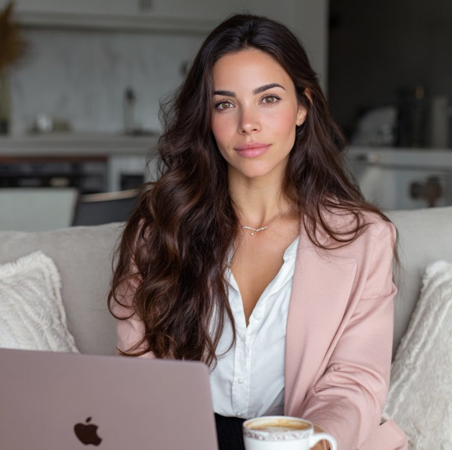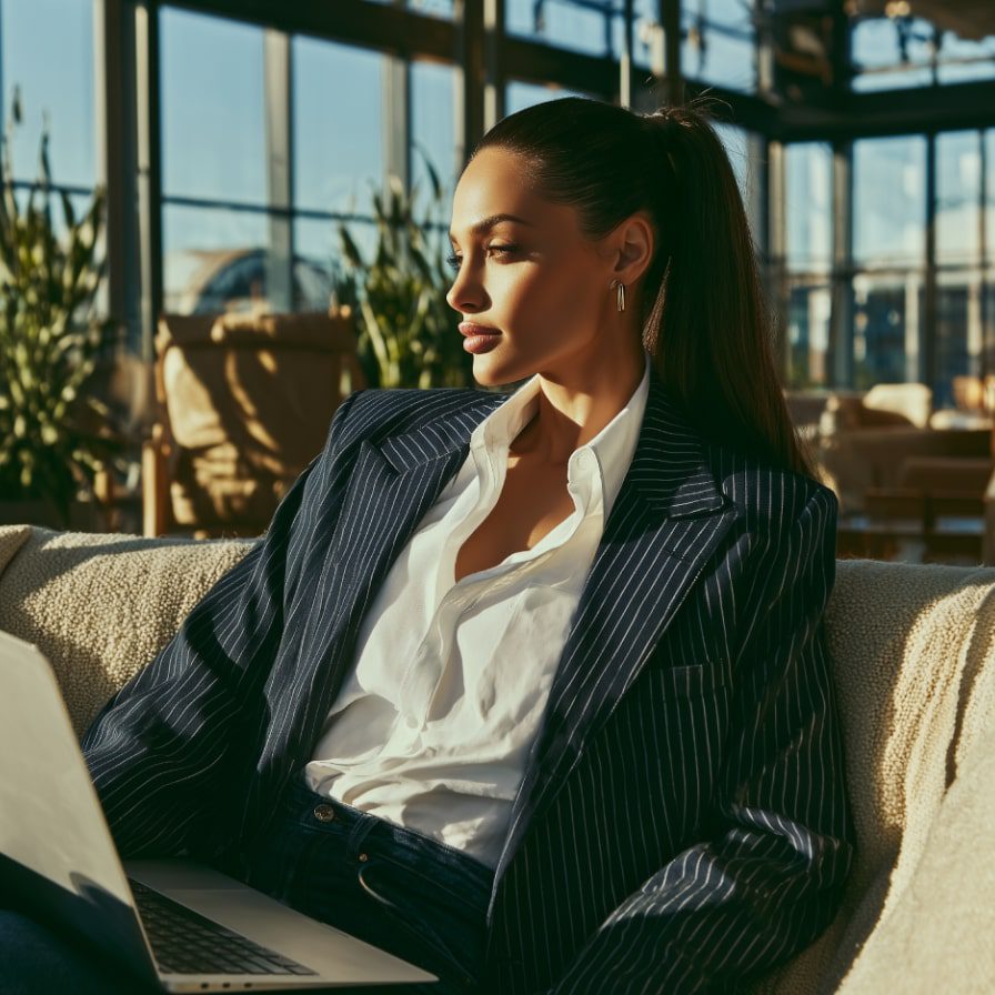 Drape yourself across a velvet sofa or mid-century accent chair, laptop balanced on your thighs. Try variations: typing, one hand in hair, feet tucked underneath. The setting says you can build an empire from any room, even one with throw pillows.