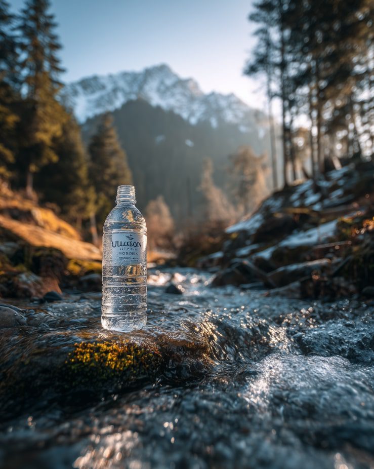 The reflection doubles the bottle, creating a quiet twin that suggests infinite refreshment.
