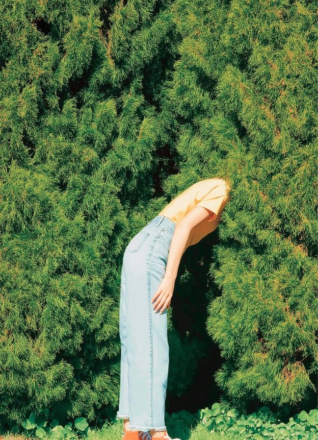 Tilt your face so half rests in light, half in shadow. Keep hands partially raised, fingertips grazing leaves or air. The half-lit tone offers layered meaning: a person caught between belonging and detachment.